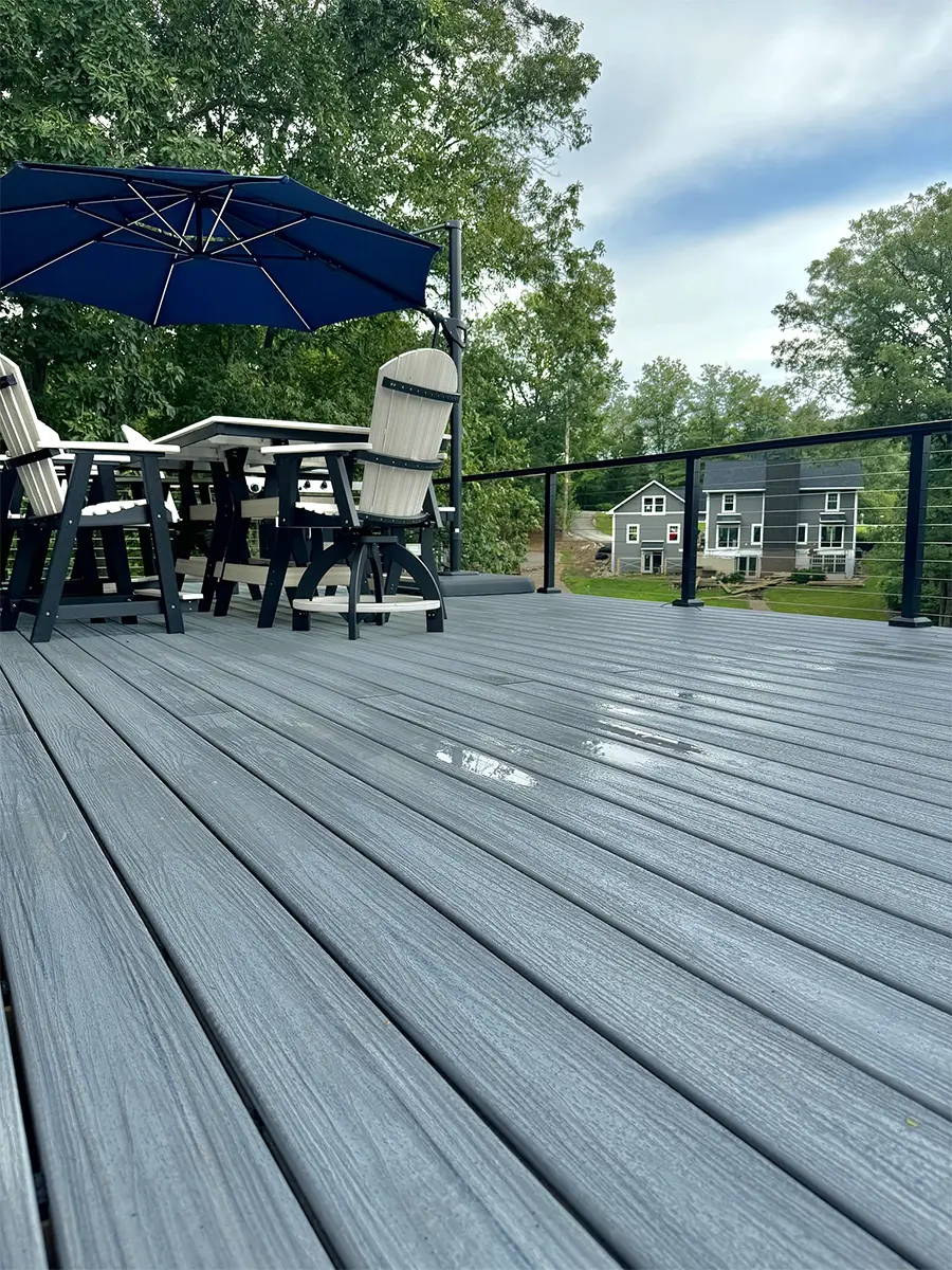 Composite decking is an eco-friendly, durable material that retains its color over time and requires minimal maintenance. No staining or sealing is necessary, and it resists weathering, warping, and pests, making it a popular choice for long-lasting decks.